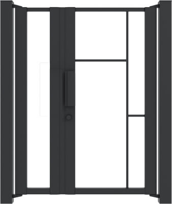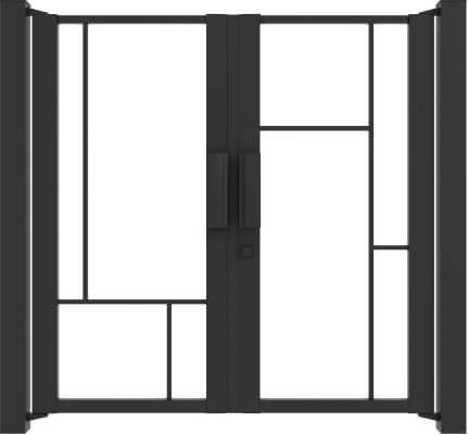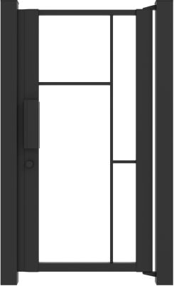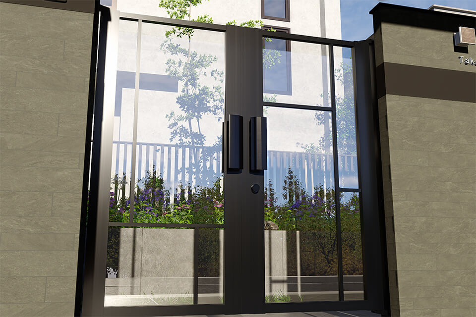 ガラスとブラックカラーが、無駄のない美しいファサードを演出。ガタつきによる音を煢然させる落とし棒を採用し、機能性にも配慮しています。