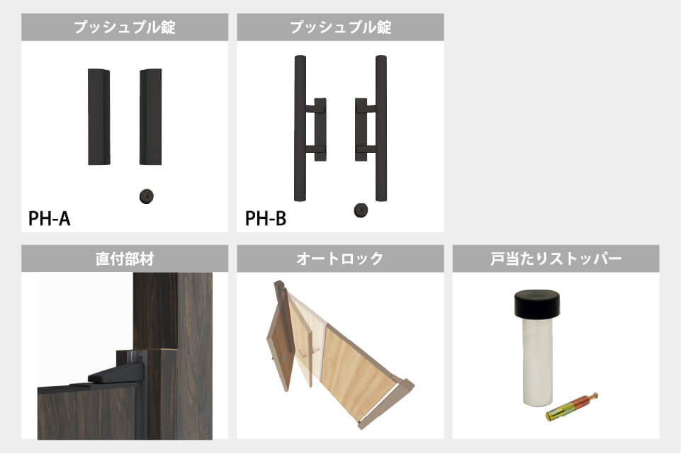 標準装備でプッシュプル錠を2種類から選択可能。さらに、直付部材やオートロック、戸当たりストッパーなど、多彩なオプション部材にも対応し、ニーズに合わせた仕様が実現できます。