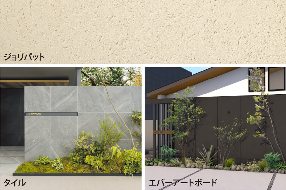 ジョリパッドでお好みのカラーやパターンに仕上げられるほか、タイル仕上げやエバーアートボード仕上げにも対応可能。お好みのデザインを自由に選べ、住まいの個性を引き立てます。